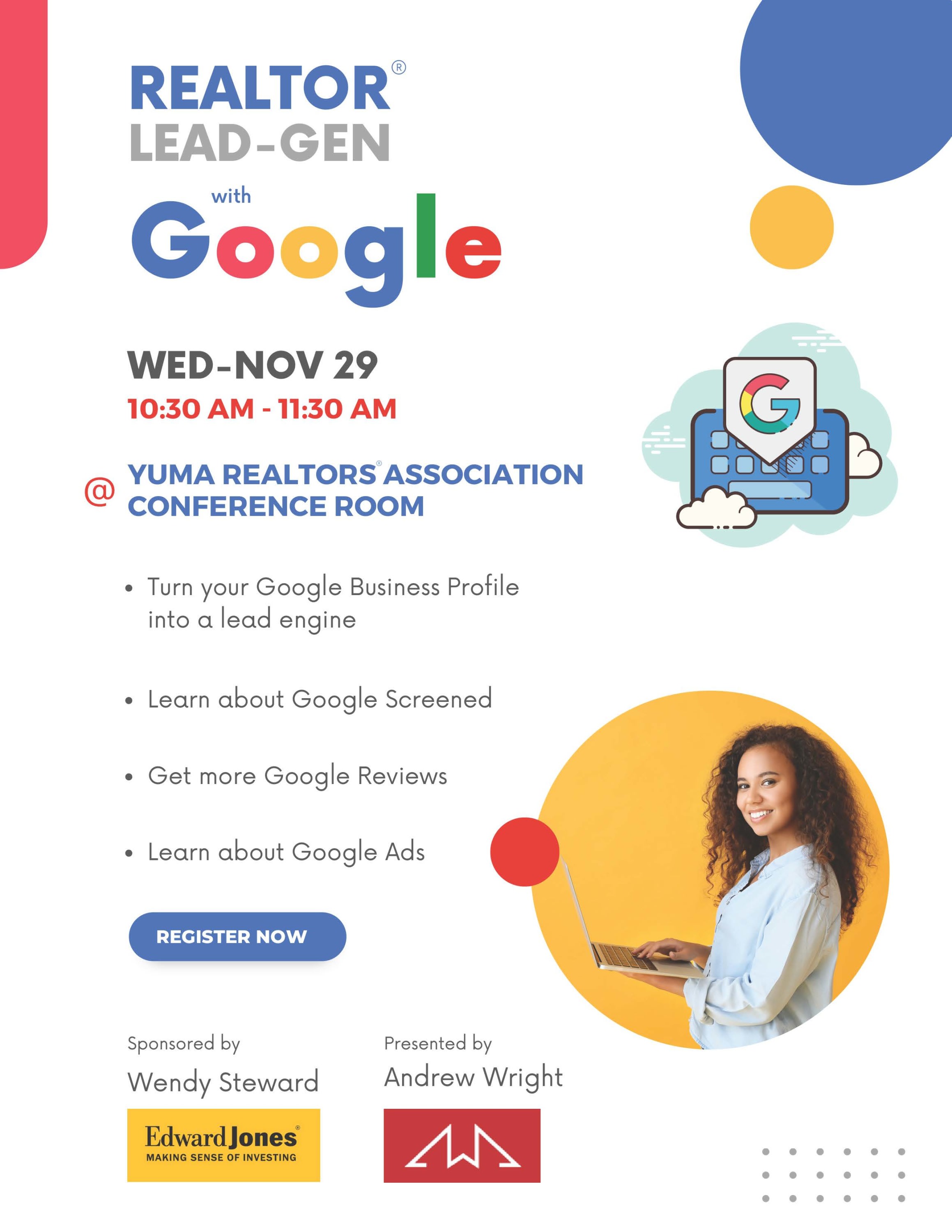 This class is part of our Collaborative Calendar with our amazing Affiliate members. Edward Jones presents REALTOR® LEAD-Gen with Google. Learn how to turn your Google Business Profile into a lead engine. Learn about Google Screened. Get more Google reviews and learn about Google Adds. To Register email jennifer.nacis@edwardjones.com
