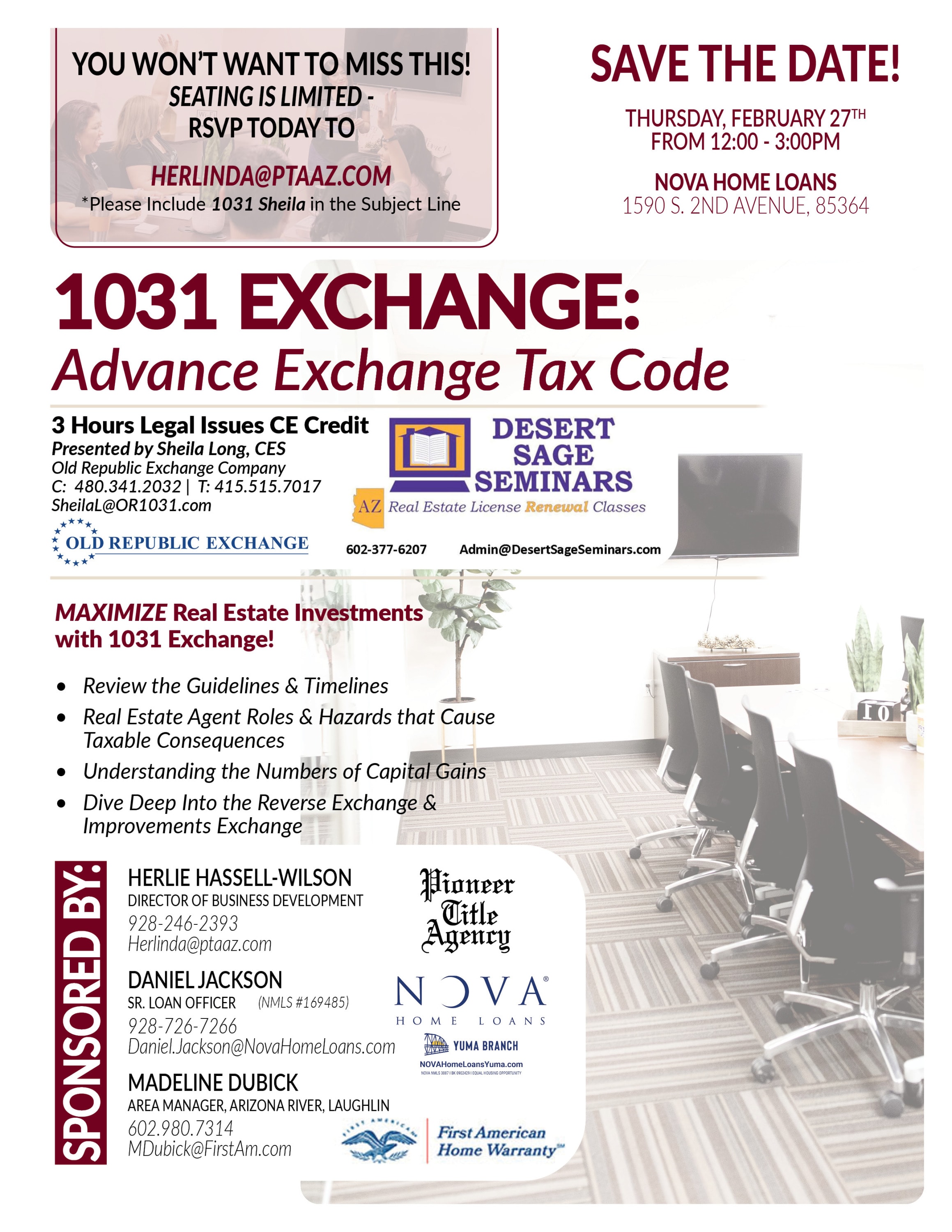 Please contact Herlinda Hassell-Wilson to register. herlinda@ptaaz.com *Please use 1031 Sheila in the subject line