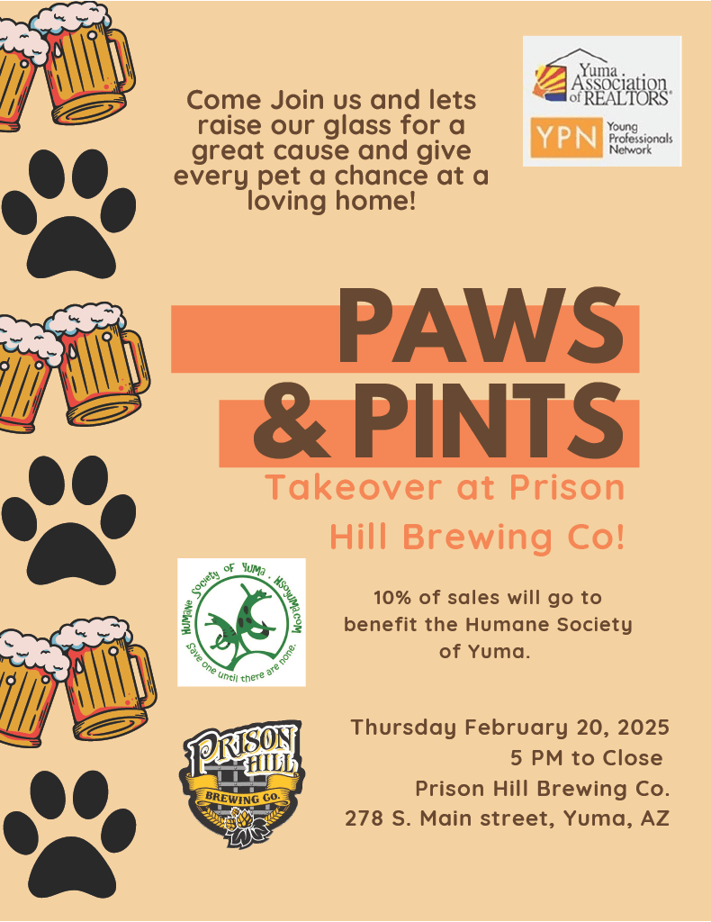 Come join the YPN for Paws & Pints takeover at Prison Hill Brewing Co. Lets raise our glass for a great cause and give every pet a chance at a loving home! NO REGISTRATION NEEDED. There will also be raffles with some awesome prizes. 10% of Sales will go the the Humane Society of Yuma!