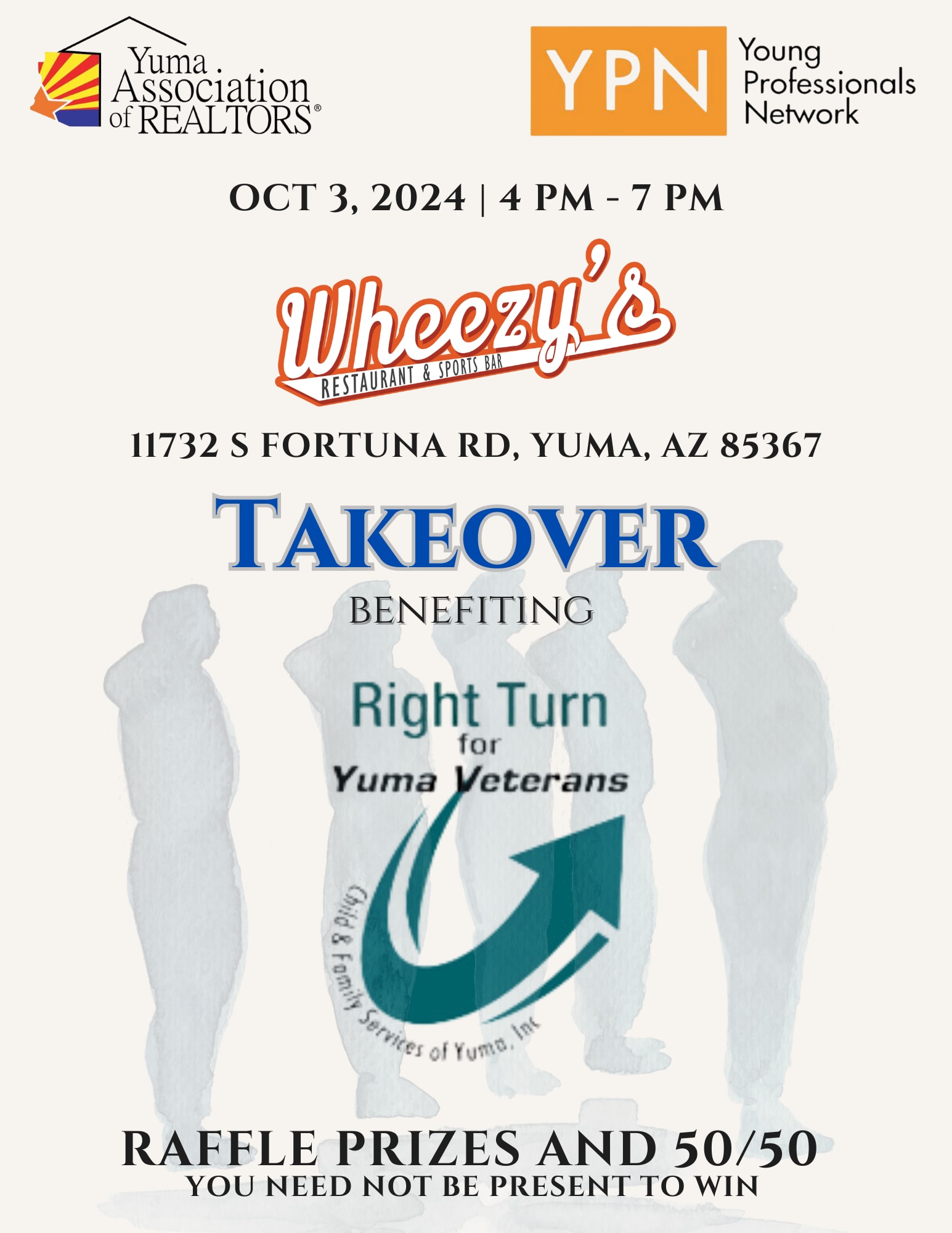 Wheezy's Takeover Event. A portion of sales will benefit Right Turn Veterans Home. Raffle Prizes and 50/50! You do not have to be present to win the Raffle Prizes. Come and network for a good cause.